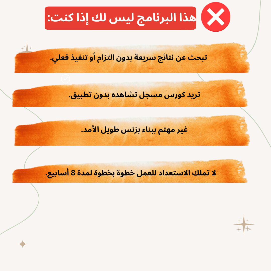 البرنامج يركز على بناء بزنس صحيح ومستقر. قد تأتي نتائج مبكرة، لكن الهدف الأساسي هو الخروج بنظام يعمل ويمكن تطويره بثقة بعد انتهاء البرنامج.